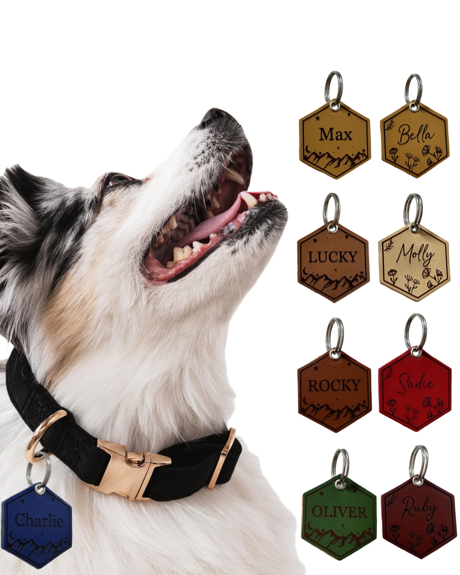 - Dog Tags Personalized: The engraved dog ID tag silencer features designs of Mountain Moonlight and Floral Haven for outdoorsy dogs; It can be customized with a name on the front and include a phone number, address, microchip number, etc. on the back